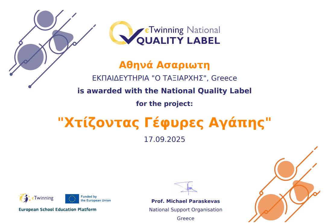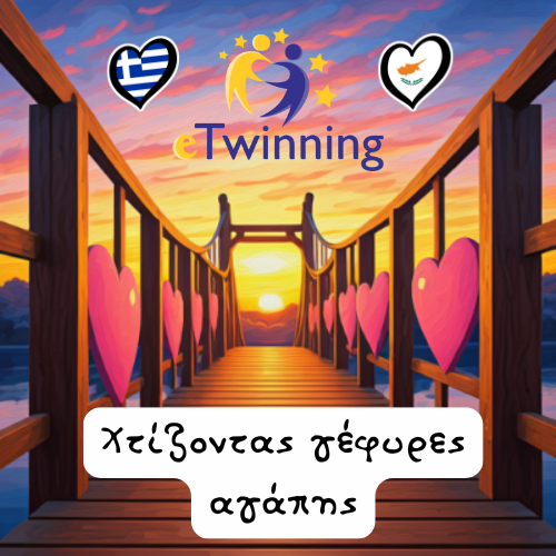 Μία νέα eTwinning συνεργασία έχει ξεκινήσει στο σχολείο μας! Το έργο “Χτίζοντας γέφυρες αγάπης” εστιάζει στην καλλιέργεια της αγάπης, της φιλίας, της συνεργασίας και της ενσυναίσθησης ανάμεσα στους μαθητές της Ελλάδας και της Κύπρου. Μέσω δημιουργικών δραστηριοτήτων, οι μαθητές θα χτίσουν “γέφυρες” επικοινωνίας και θα ανταλλάξουν πολιτιστικές και συναισθηματικές εμπειρίες.
