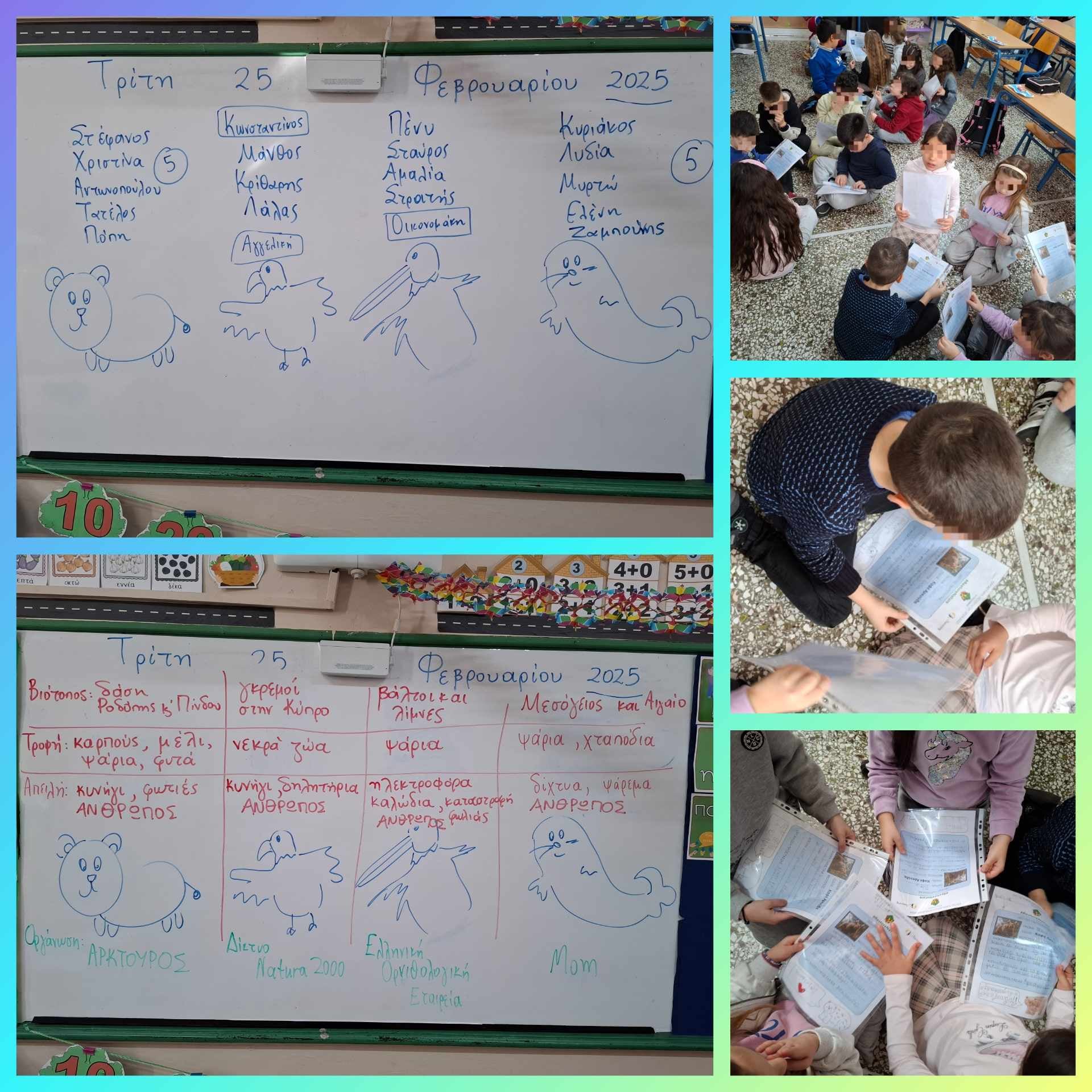Μελετήσαμε τον χάρτη κι επιλέξαμε ο καθένας έναν βιότοπο της Ελλάδας. Αναζητήσαμε πληροφορίες σε εγκυκλοπαίδειες ή στο διαδίκτυο για την γεωγραφική του θέση, το έτος θεσμοθέτησής του, την έκτασή του, καθώς και την πανίδα και τη χλωρίδα που ζουν και αναπτύσσονται εκεί.