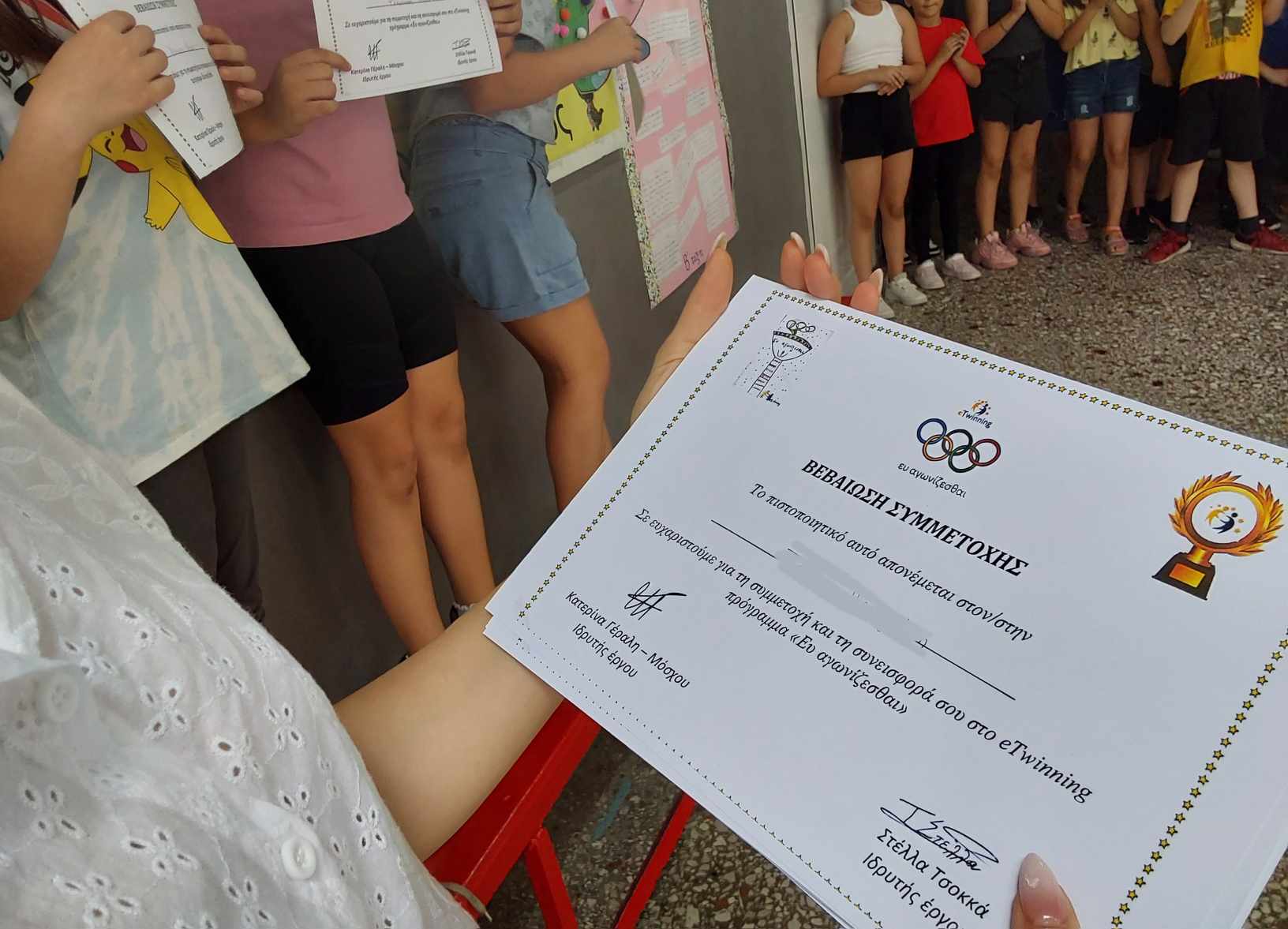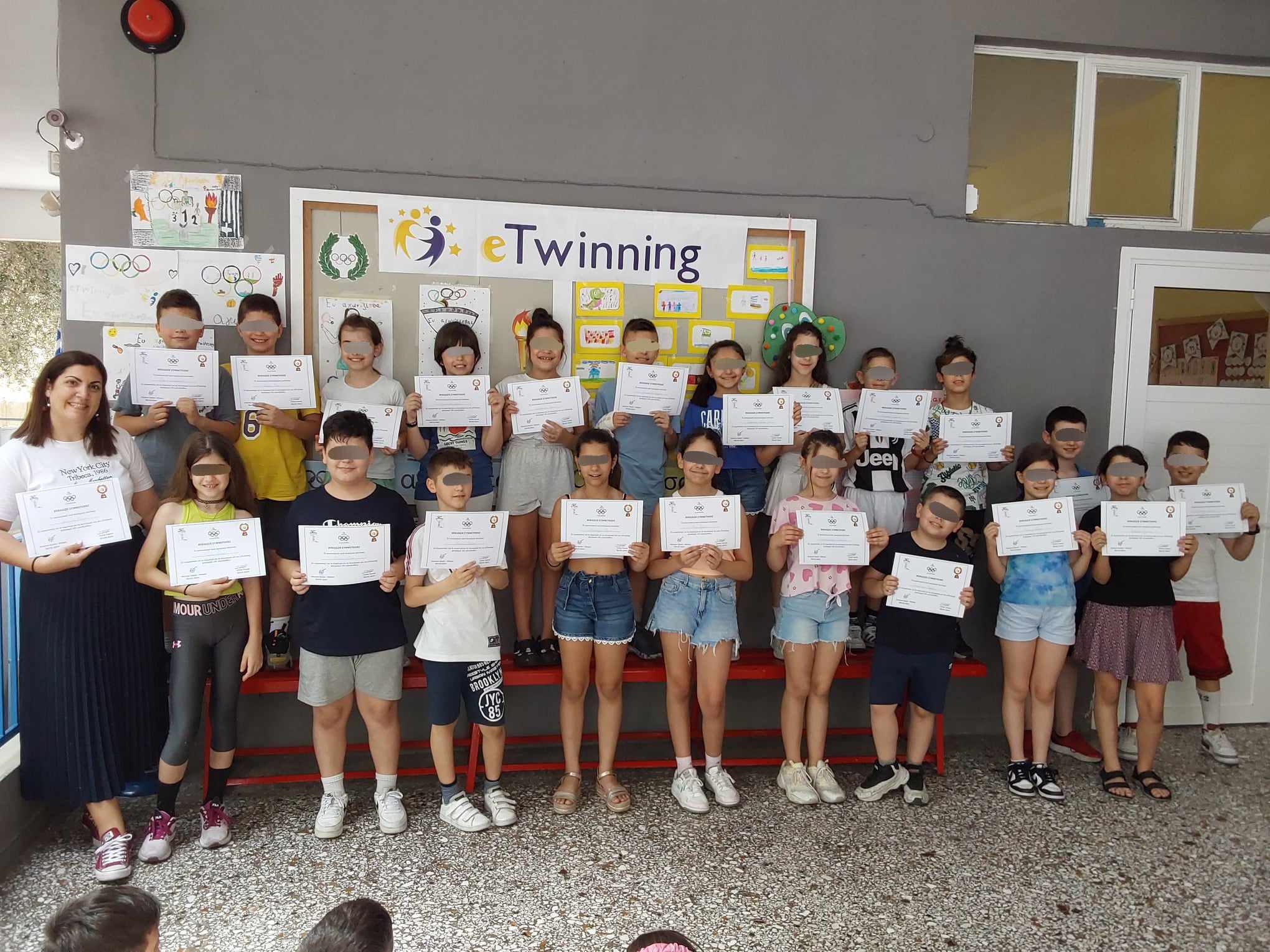 Κάπου εδώ το πρόγραμμά μας έφτασε στο τέλος του… Στην τελετή βράβευσης που διοργανώσαμε τα παιδιά πήραν τιμητικές βεβαιώσεις συμμετοχής για τη συνεισφορά τους στο πρόγραμμα eTwinning “Ευ αγωνίζεσθαι”.