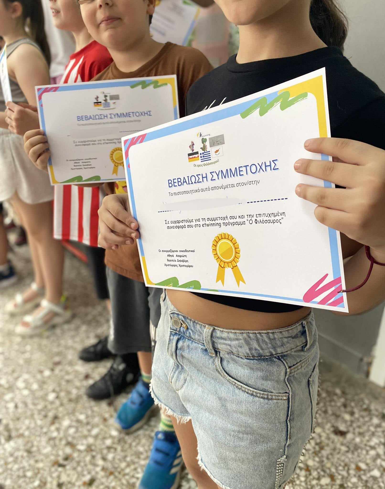 Κάπου εδώ το πρόγραμμά μας έφτασε στο τέλος του… Στην τελετή βράβευσης που διοργανώσαμε τα παιδιά πήραν τιμητικές βεβαιώσεις συμμετοχής για τη συνεισφορά τους στο πρόγραμμα eTwinning “Ο Φιλόσαυρος”.